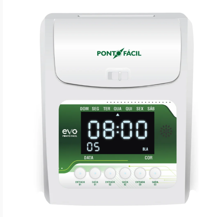 O Ponto Fácil, relógio de ponto cartográfico da EVO, está adequado às normas da portaria 671 do MTE. Possui amplo display para melhor visualização do horário, estrutura em ABS com design compacto e arrojado. Sua operação simples, por marcação em cartão de cartolina, é uma opção prática e econômica para pequenas empresas, substituindo a marcação manual do livro ponto. Ideal para lojas, comércios, escritórios, consultórios e microempresas.